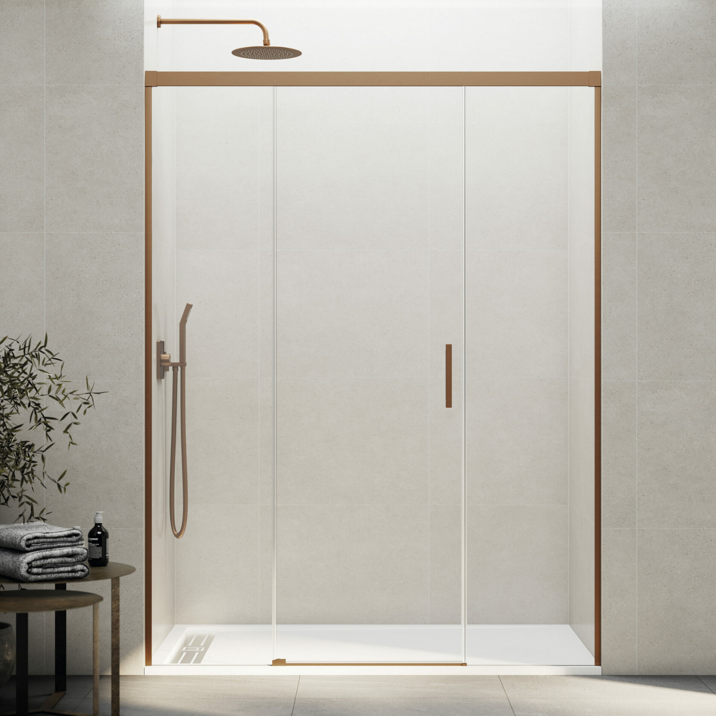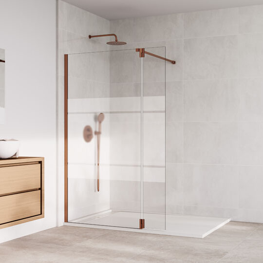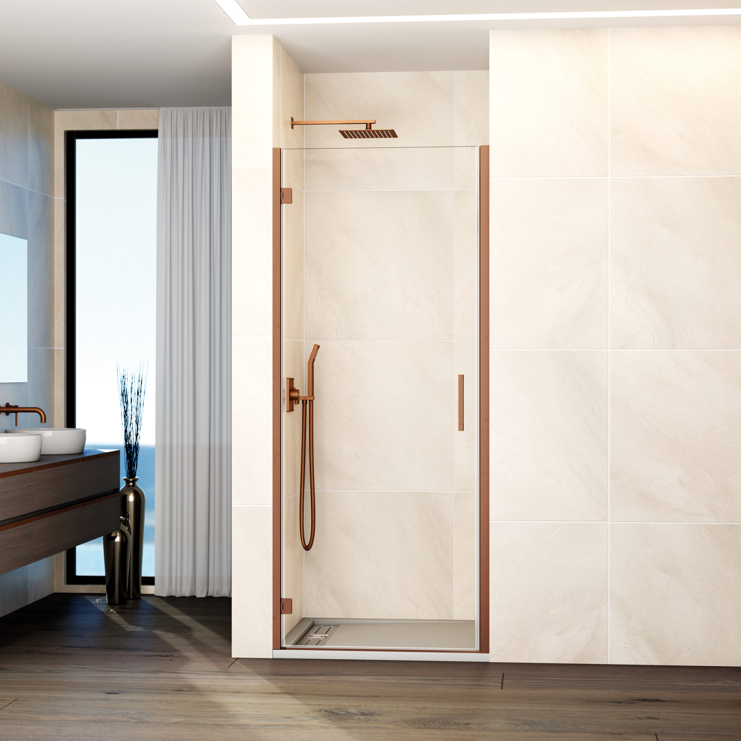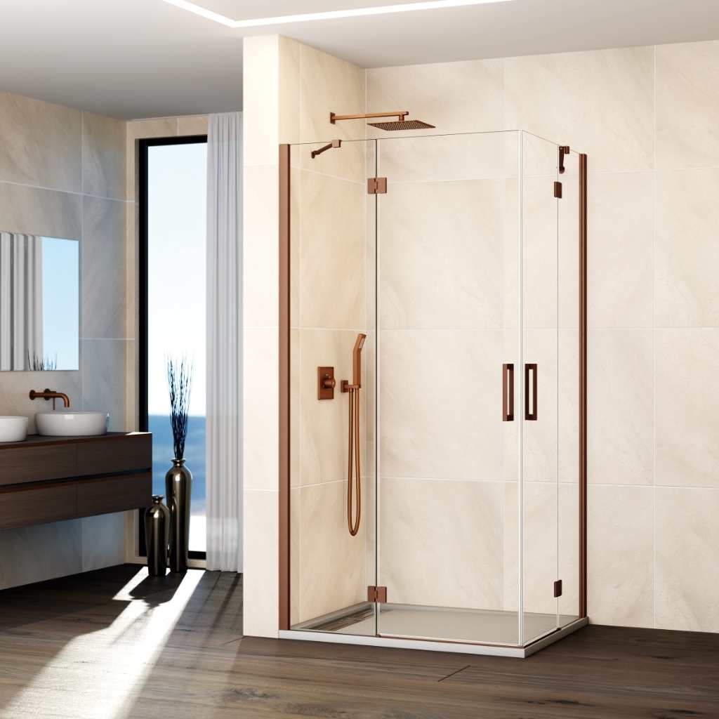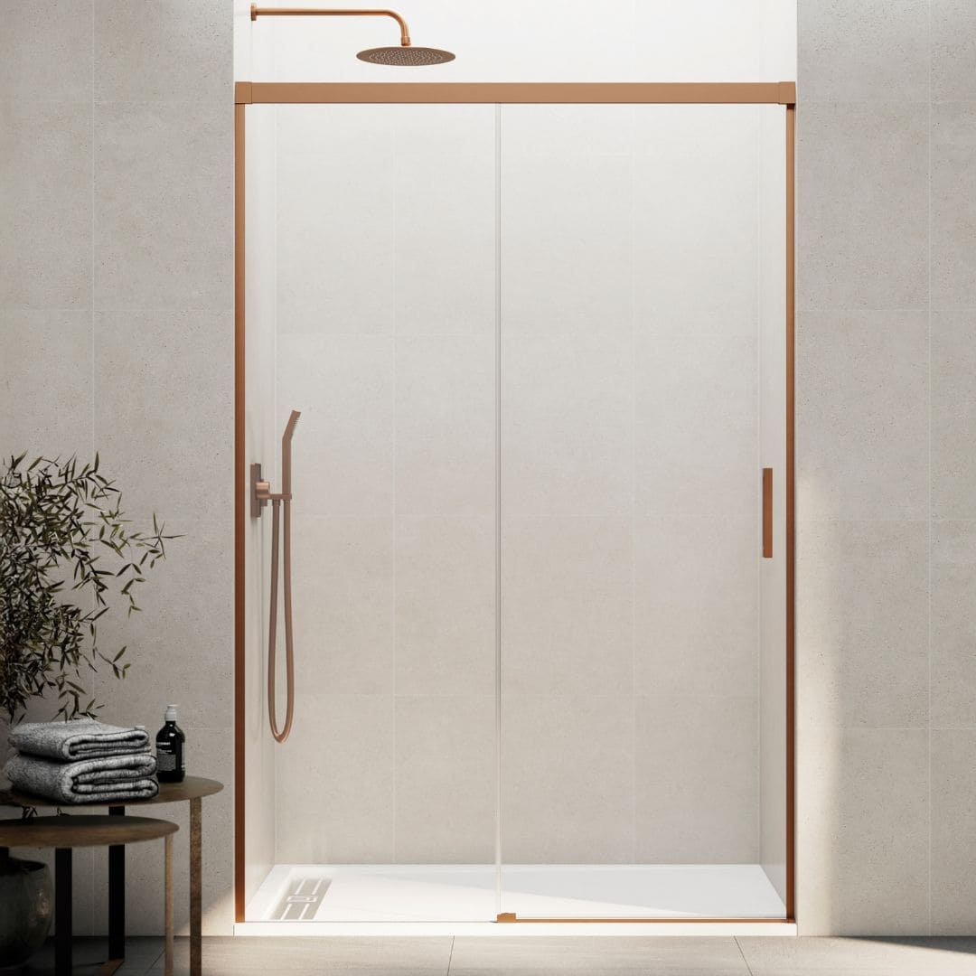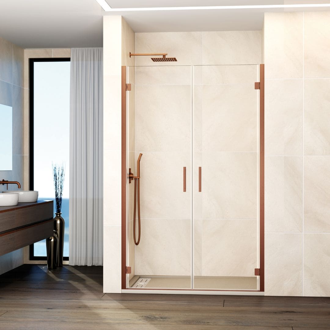 Complementa tu grifería con una mampara de ducha en cobre, disponible en tres modelos clave de GME: