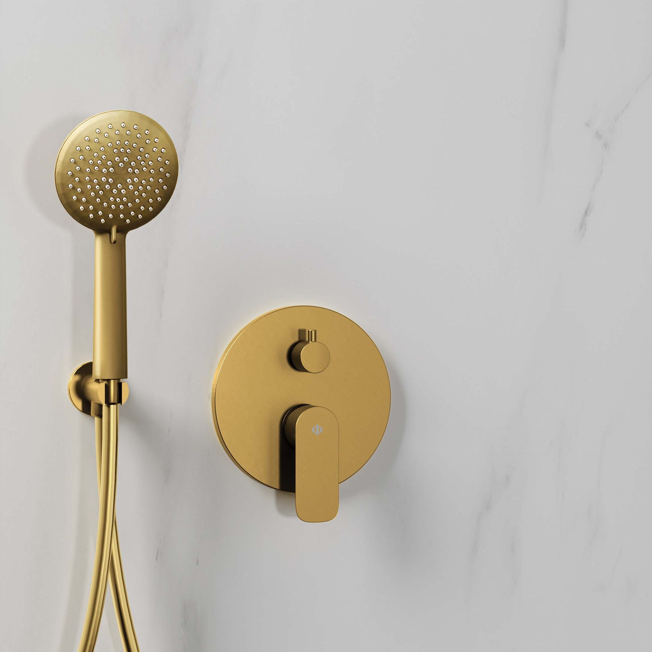 Round handshower in white, nickel and gold.