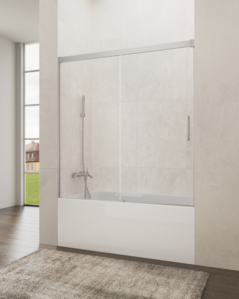 Front bathtub screen with sliding door, minimalist aluminum profiles with 6mm tempered glass and anti-limescale treatment. Double bearing in silent nylon with modern design without lower profiles. Sizes to choose. Immediate delivery.