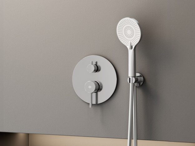 Conjunto empotrable monomando redondo para ducha fabricado en latón, con caja de registro, disponible en formato monomando y acabados cromado, negro mate, blanco, níquel y oro. No incluye rociador superior.