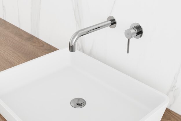 Grifo empotrable monomando para lavabo fabricado en latón con un diseño minimalista combinando superficies redondas con un toque elegante y funcional. Disponible en 7 acabados: cromo, negro mate, blanco, titanio, oro PVD, cobre PVD y níquel PVD, para que puedas elegir el estilo que mejor se adapte a tu baño.