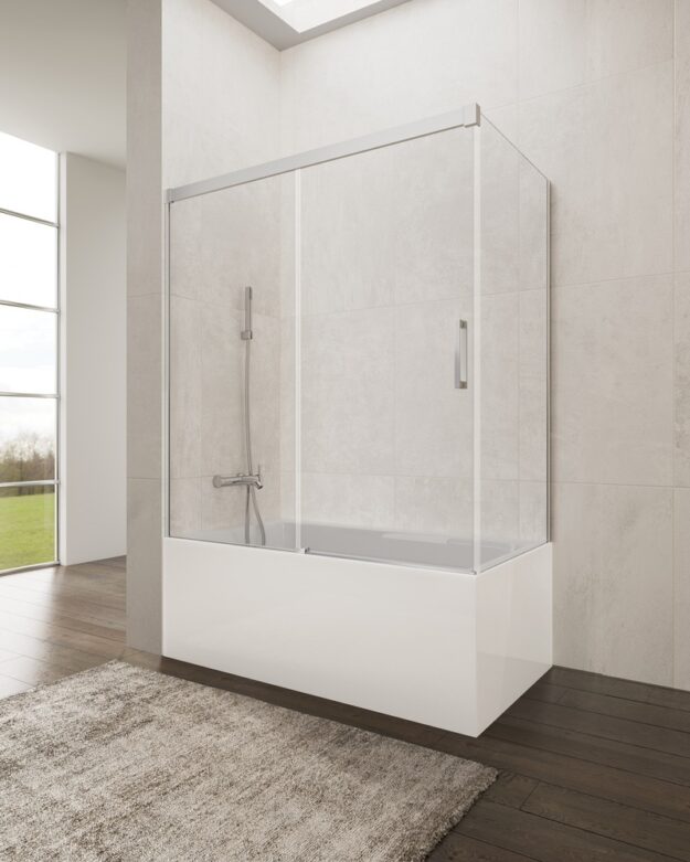 Descubre la elegancia y funcionalidad en una sola pieza con nuestra mampara de bañera angular Basic 2f+2c + lat. fijo.