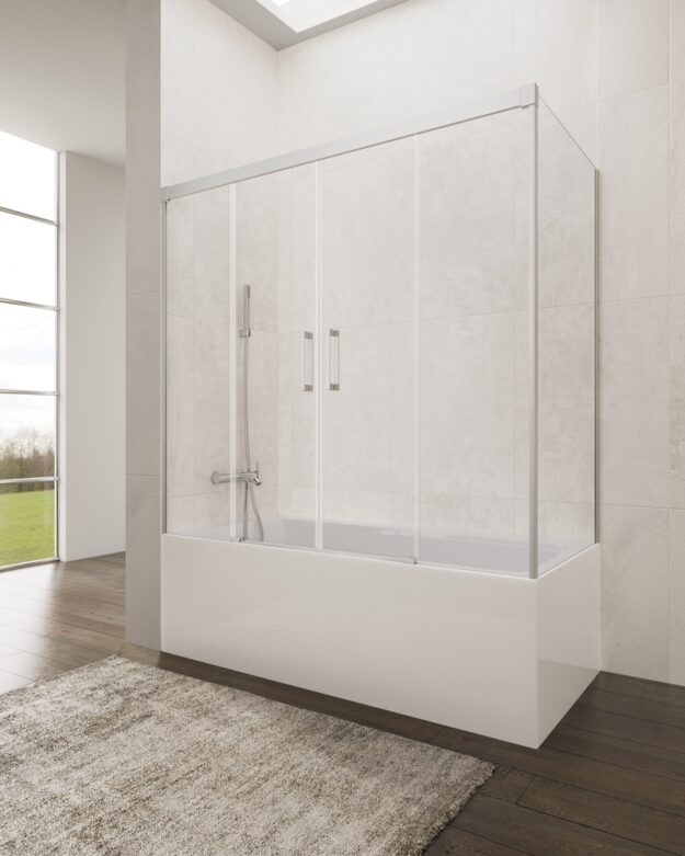 Mampara de bañera frontal con dos fijos y dos puertas correderas de apertura central, perfilería minimalista de aluminio con cristales templados de 6mm y tratamiento antical. Doble rodamiento en nylon silencioso con diseño actual sin perfilería inferior. Medidas a elegir. Entrega inmediata.