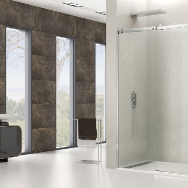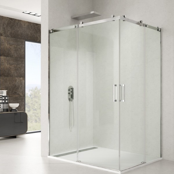 The shower enclosure is equipped with vertical gutter rubbers to guarantee watertightness in the gap between the sliding panel and the fixed glass.
