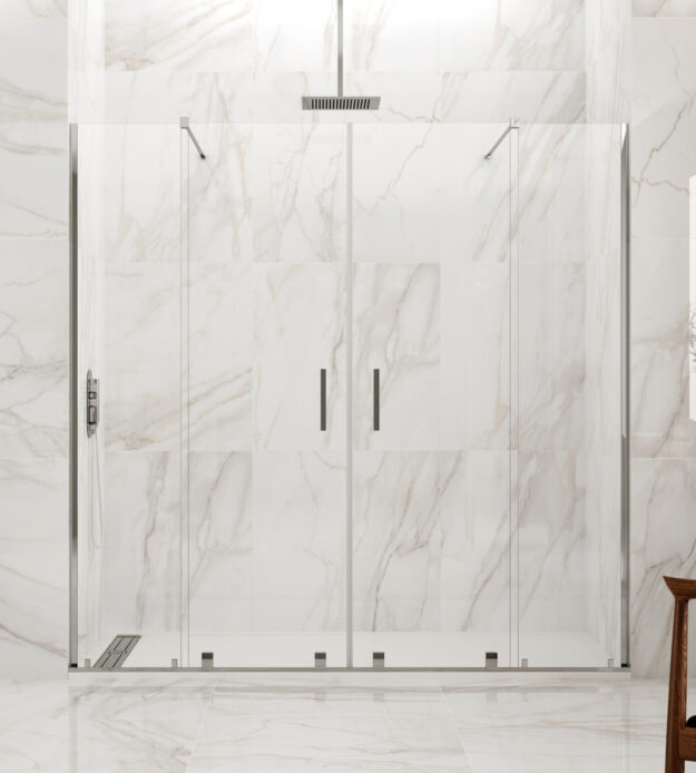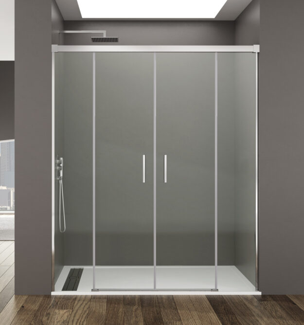Mampara de ducha frontal con dos fijos y dos puertas correderas de apertura central, perfilería minimalista de aluminio con cristales templados de 6mm y tratamiento antical. Doble rodamiento en nylon silencioso con diseño actual sin perfilería inferior. Medidas a elegir. Entrega inmediata.