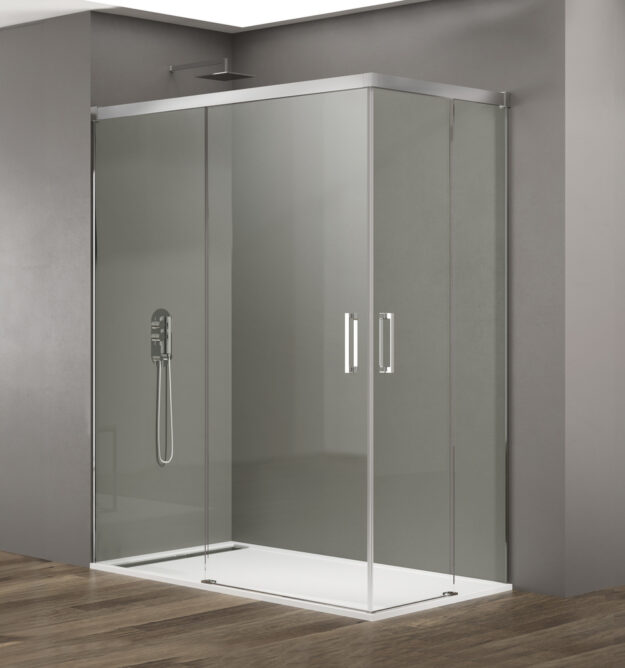 Mampara de ducha angular compuesta por frontal fijo más corredera y lateral fijo de 6mm con perfilería minimalista de aluminio pulido brillo de tan solo 20mm. Cristales templados de 6mm con tratamiento antical. Entrega inmediata.