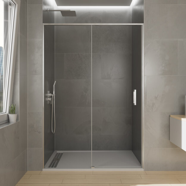 Mampara de ducha frontal con puerta corredera, perfilería minimalista de aluminio con cristales templados de 6mm y tratamiento antical. Doble rodamiento en nylon silencioso con diseño actual sin perfilería inferior. Medidas a elegir. Entrega inmediata.