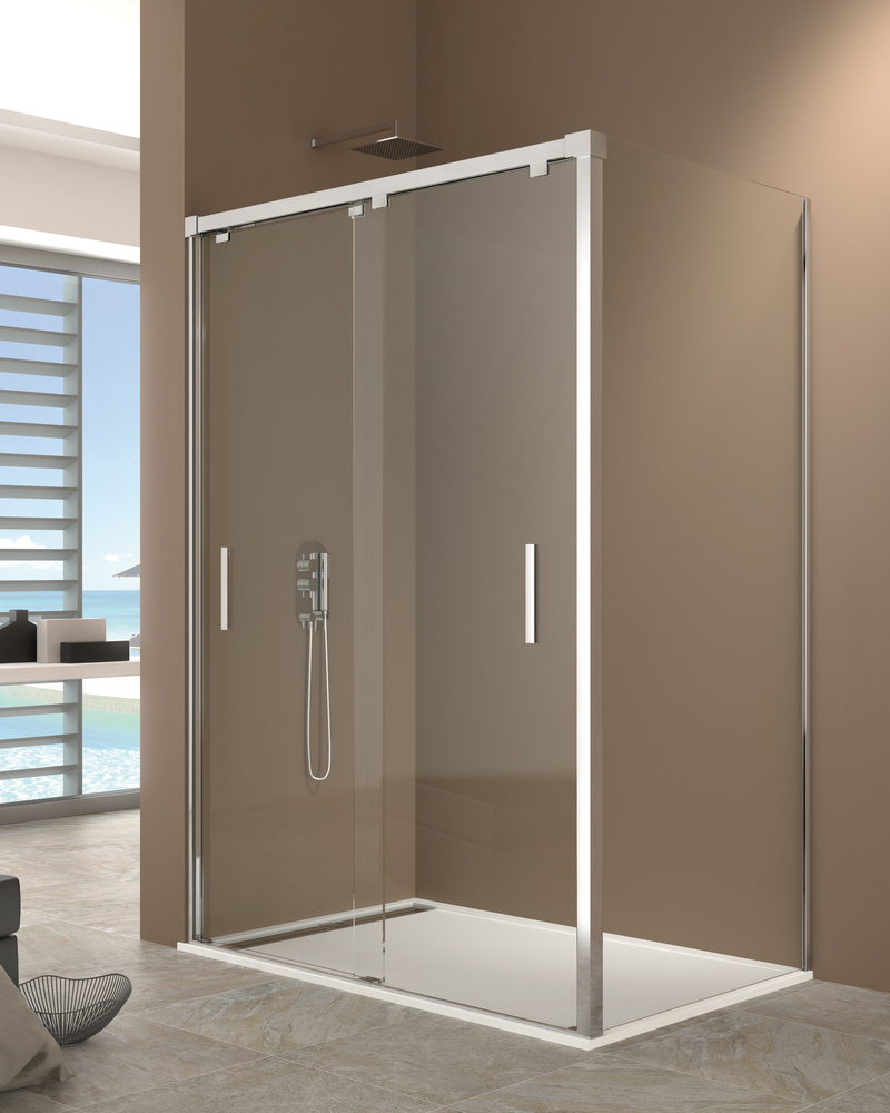 Paroi de douche angulaire avec deux portes coulissantes permettant l'accès des deux côtés plus un fixe fixe. Fabriqué en luminosité en aluminium poli avec des cristaux tempérés de 6 mm. Mesures à choisir. Livraison immédiate.