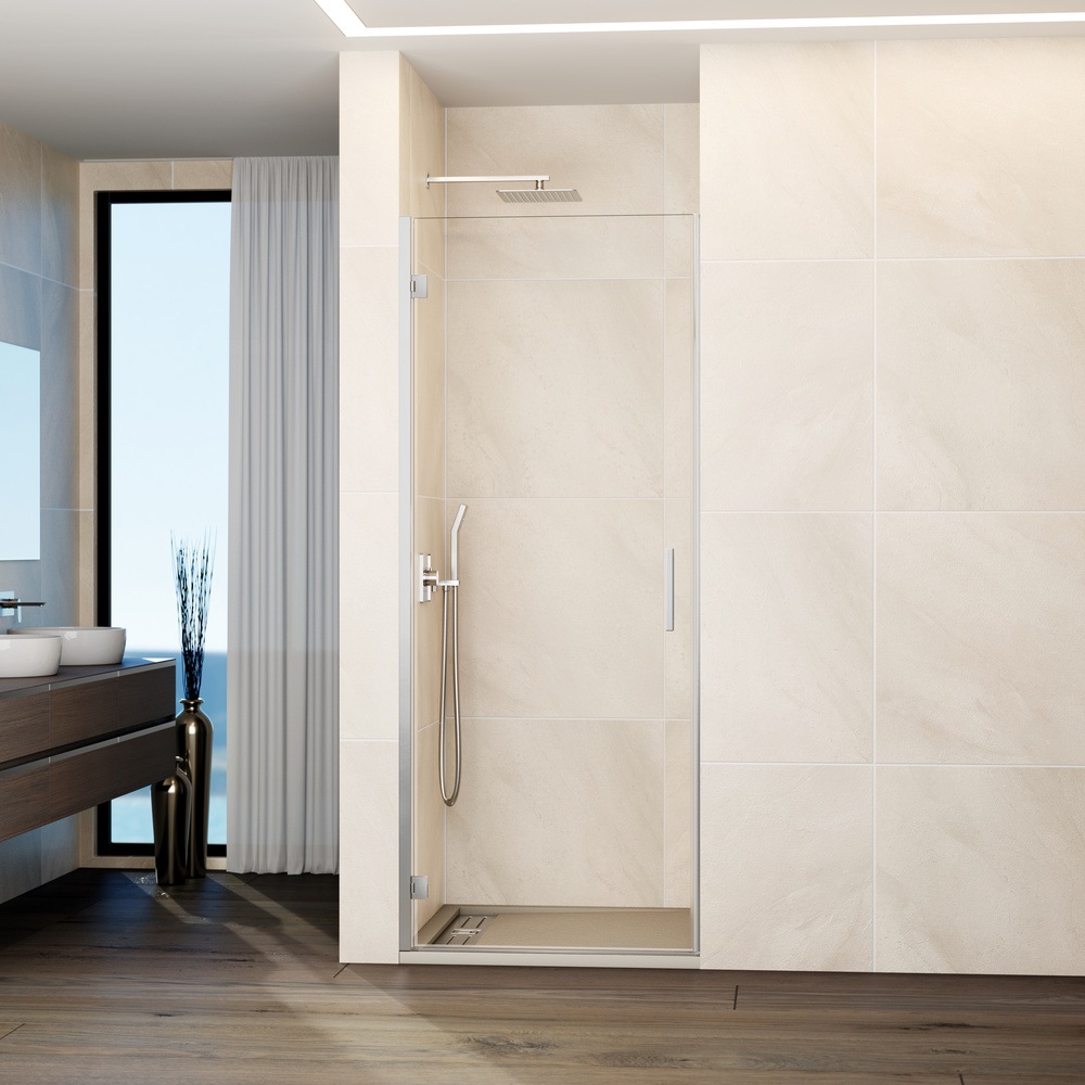 Paroi de douche frontale avec porte battante avec charnière murale ou sur profil, profilé en aluminium et verre trempé de 6mm avec traitement anticalcaire. Design minimaliste moderne sans profilé inférieur et fermeture magnétique murale. Dimensions au choix. Livraison immédiate.