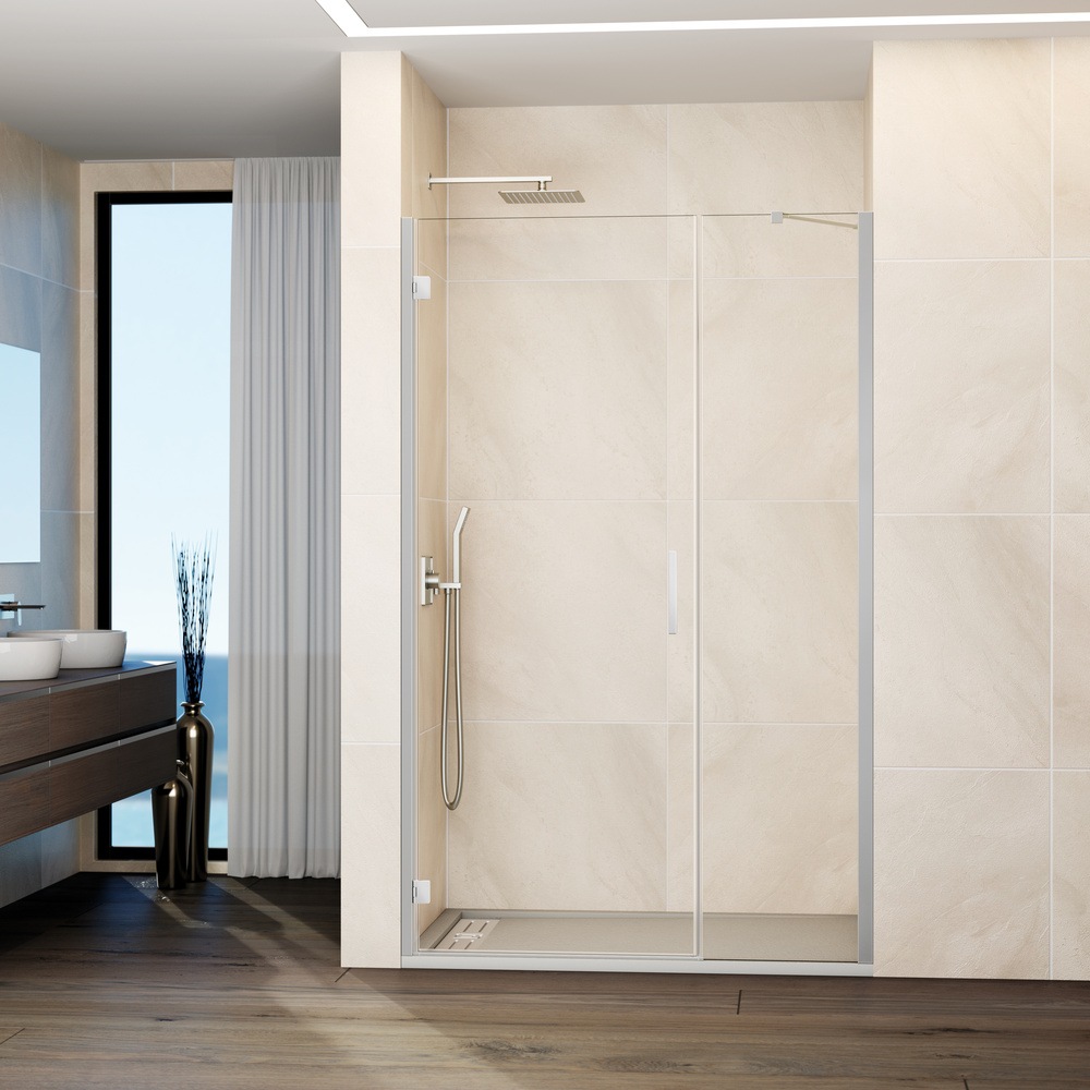 Paroi de douche frontale avec un panneau fixe de 8mm et une porte battante de 6mm avec charnière en acier inoxydable, avec fermeture magnétique a fixe. Verre trempé et profilé en aluminium. Design minimaliste moderne sans profilé inférieur. Dimensions au choix. Livraison immédiate.