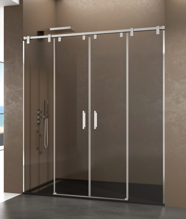 Mampara de ducha frontal con dos fijos y dos puertas correderas, perfilería minimalista en acero inoxidable pulido brillo con cristales templados de 6mm y tratamiento antical. Doble rodamiento en nylon silencioso con diseño actual sin perfilería inferior. Entrega inmediata.