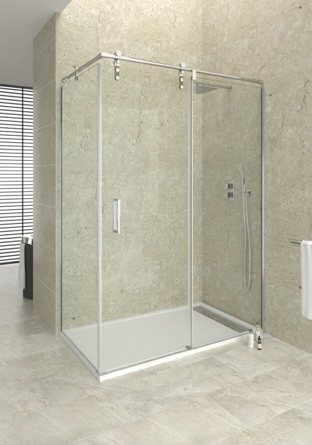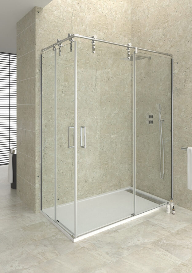 Mampara de ducha angular con fijo y puerta corredera más lateral fijo de 8mm, perfilería minimalista en acero inoxidable pulido brillo con cristales templados de 6 y 8 mm y tratamiento antical. Doble rodamiento en nylon silencioso con diseño actual sin perfilería inferior. Entrega inmediata.