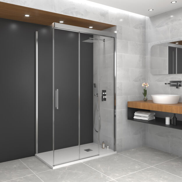Mampara de ducha angular de entrada al vértice con dos fijos y dos puertas correderas, perfilería minimalista en acero inoxidable pulido brillo con cristales templados de 6mm y tratamiento antical. Doble rodamiento en nylon silencioso con diseño actual sin perfileria inferior. Entrega inmediata.
