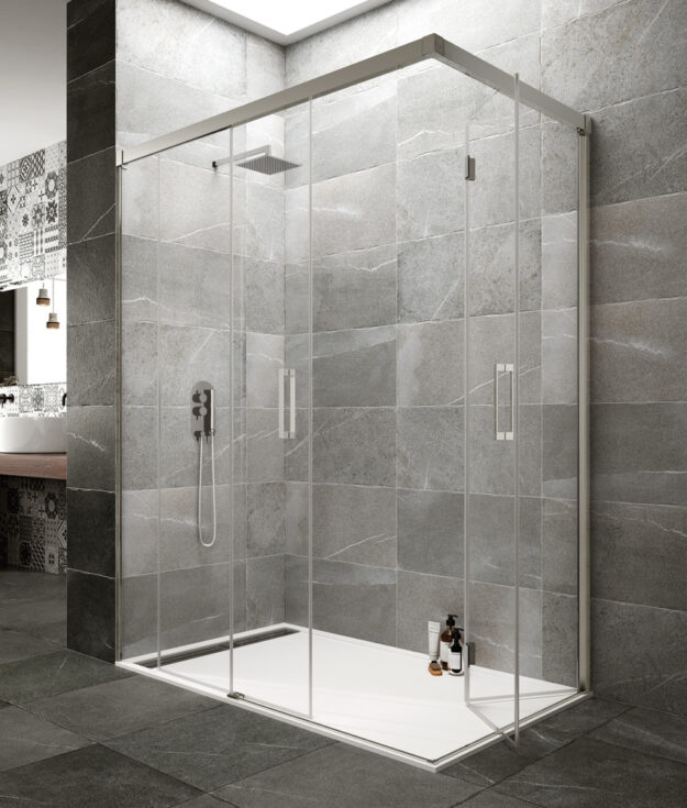 Mampara de ducha angular compuesta por un lado de fijo más corredera y otro lado de puerta plegable al interior del plato, para conseguir un máximo espacio de entrada a la ducha . Perfilería de aluminio pulido brillo y cristales templados de 6mm con tratamiento antical. Entrega inmediata