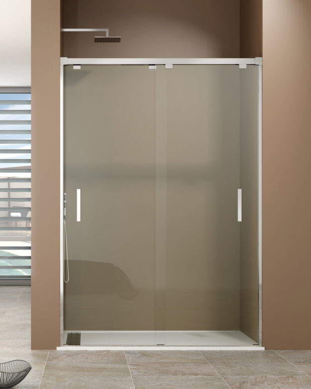 Mampara de ducha frontal con dos puertas correderas que permiten su acceso por ambos lados. Fabricada en aluminio pulido brillo con cristales templados de 6mm. Posibilidad de acoplar lateral fijo de la misma serie. Medidas a elegir. Entrega inmediata.