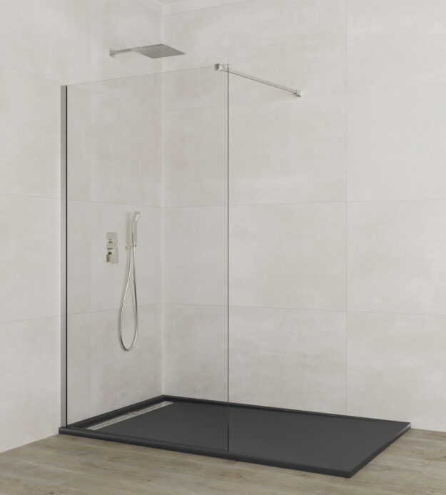 Paneles fijos de 8mm para mampara de ducha de 6mm abatible con bisagras de latón cromado en diferentes medidas, con perfilería de aluminio y brazo de sujeción incluido, para crear cualquier combinación con puertas abatibles para la ducha.