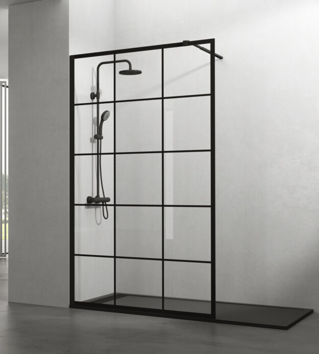 Panel fijo de ducha transparente con perfilería minimalista en aluminio negro mate y cristal templado de 8mm con decorado negro black chess y tratamiento antical. Entrega inmediata.
