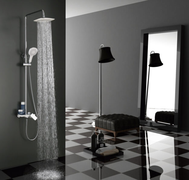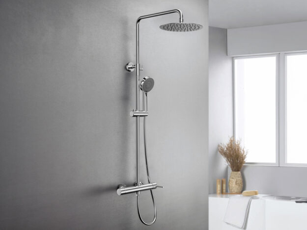 Ducha vista monomando con cuerpo de grifería en latón cromado y barra de acero inoxidable, rociador extraplano de 25cm, desviador integrado en la grifería y soporte regulable en altura.