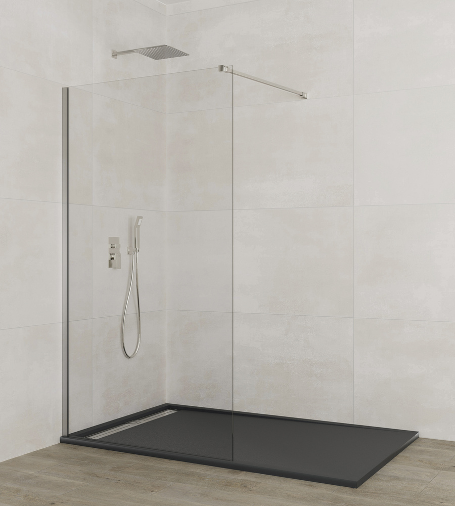 Cette paroi fixe se compose d’un verre décoratif fixé par une structure minimaliste en aluminium et des bras de soutien extensibles en acier inoxydable, pouvant être installés en ligne droite ou en diagonale pour contourner fenêtres ou obstacles. Ces bras sont réglables de 55 à 100 cm, s’adaptant ainsi à tous types de receveurs de douche.