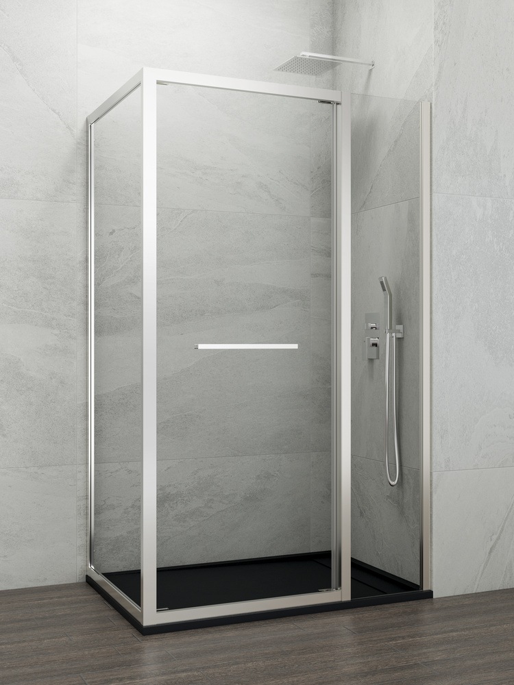 Paroi de douche fixe avant + porte + côté fixe pour petits espaces en aluminium avec verre trempé de 6mm. Ses roulements réglables permettent une ouverture complète de la porte en glissant sur le rail latéral. Disponible en chrome et en noir. Livraison immédiate.