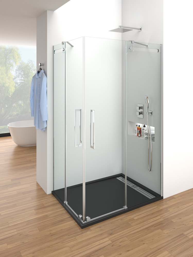Apertuture Angulaire Douche Douche design frontal-Garde avec 2 portes coulissantes fixes 2 et 2, absence de profilage donnant une prééminence à ses cristaux de 10 et 8 mm avec traitement anti-traitement. Tous ses accessoires en luminosité polie en acier inoxydable. Livraison immédiate.