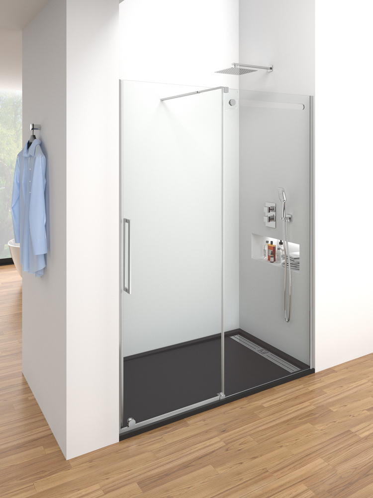 Paroi de douche frontal avec porte coulissante de design d'frontal-garde, absence de profilage, lui donnant du protagonisme à ses cristaux de 10 et 8 mm avec traitement anti-urticaire. Barre de stabilisation, profilé et repos de composants en luminosité polie en acier inoxydable. Mesures à choisir. Livraison immédiate.