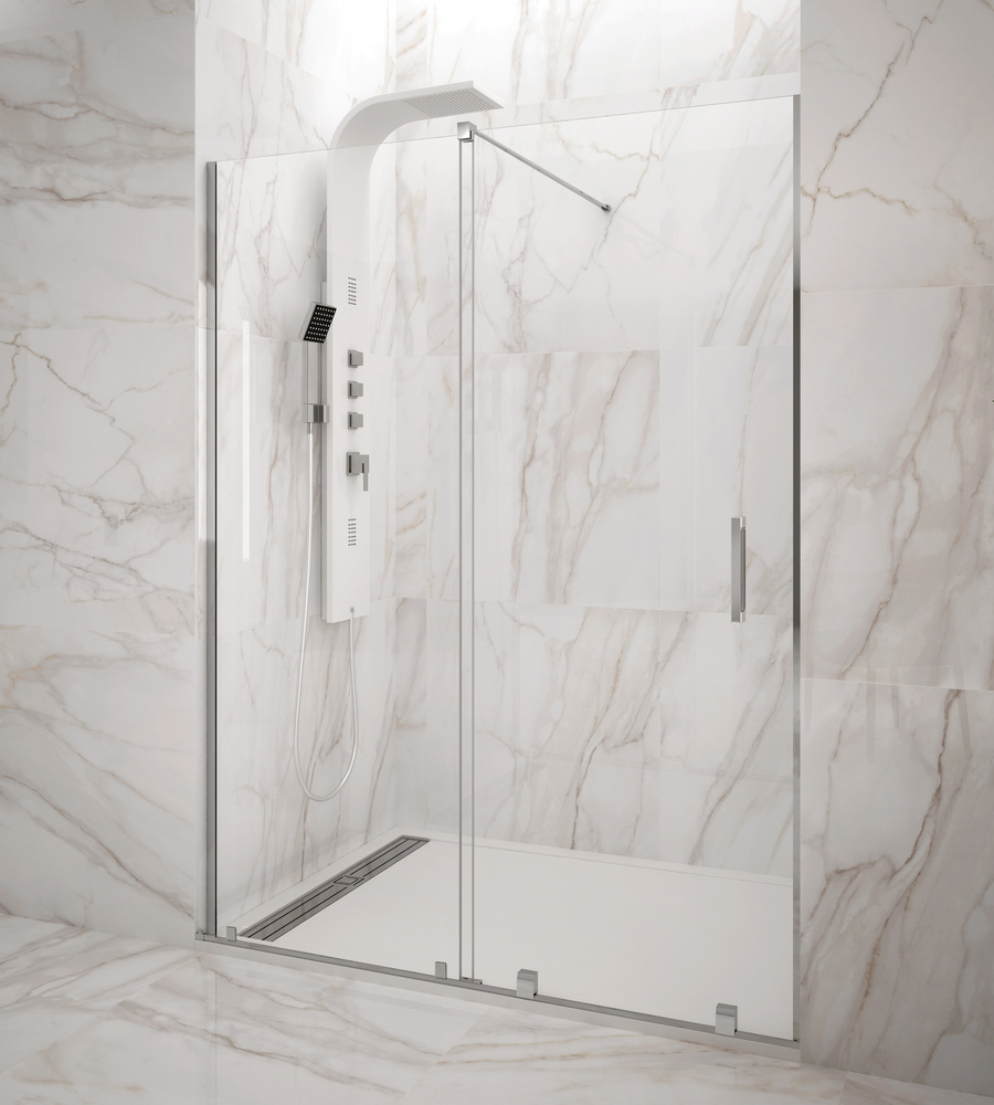 Paroi de douche frontal en luminosité en aluminium poli avec porte coulissante de design d'frontal-garde, l'absence de profilage lui donnant la priorité à ses cristaux de 6 mm avec traitement anti-6 mm. Barre de stabilisation et voie d'acier. Livraison immédiate.