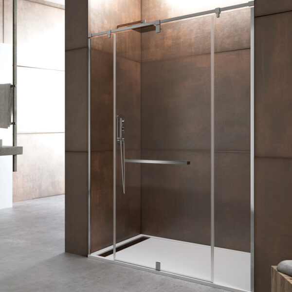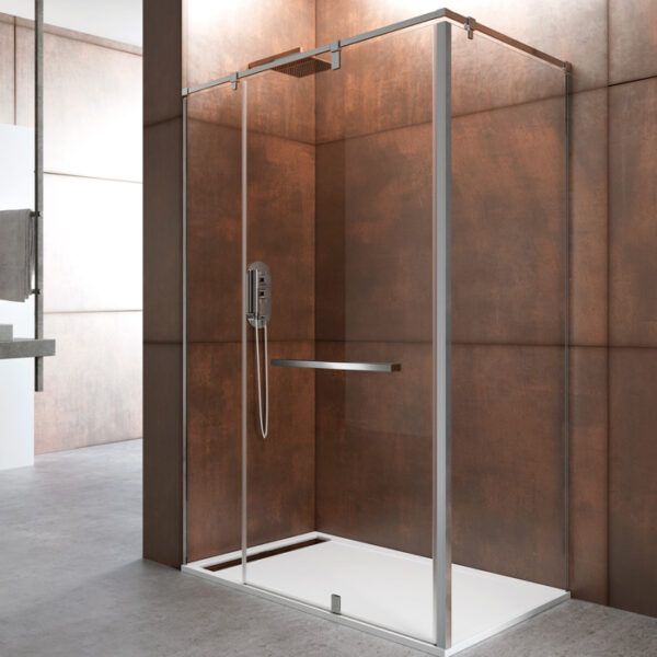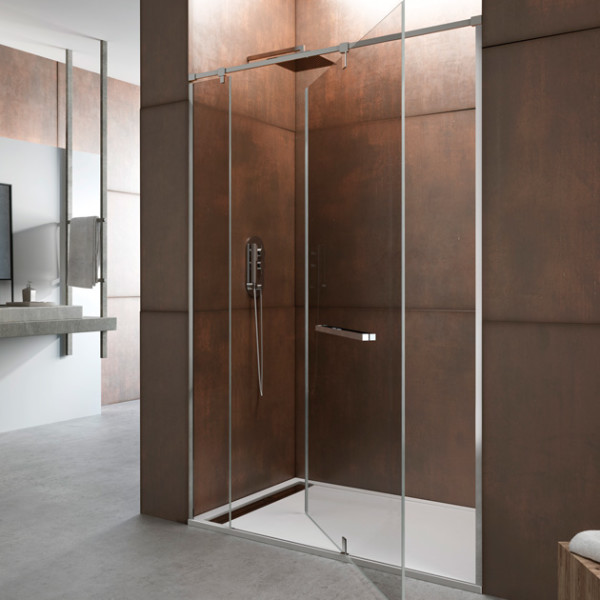 Box doccia GIRO porta girevole 360º. Realizzato con cristalli di spessore 6/8 mm. Giro è disponibile in versione porta girevole, porta girevole più fissa e porta girevole più 2 formati fissi. Possibilità di abbinare uno qualsiasi dei formati sopra menzionati con il lato fisso 8 mm STD.
