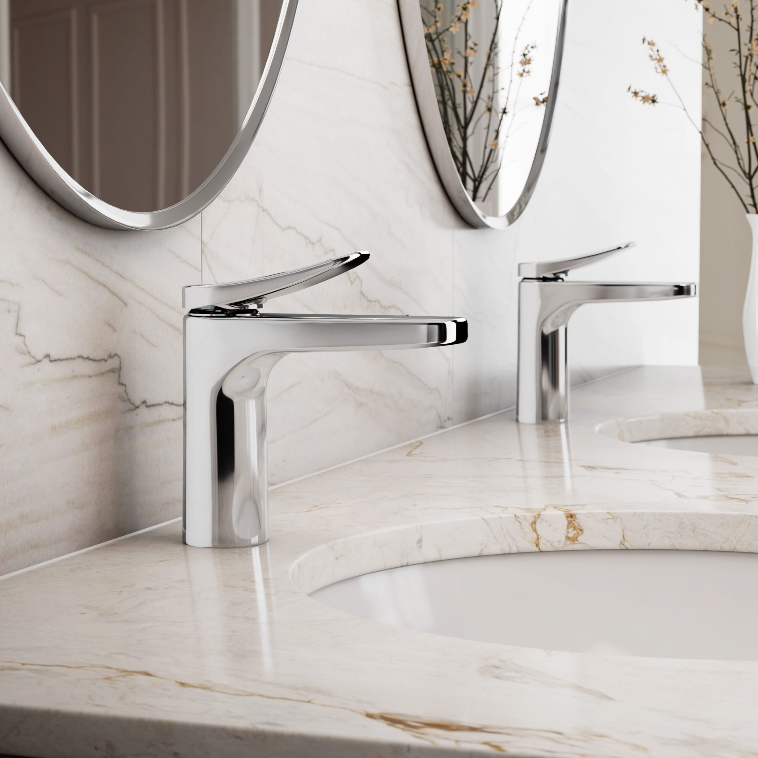 Diseñado con una mirada limpia y atenta, CLIO no necesita destacar para llamar la atención. Su silueta envolvente, sin aristas ni interrupciones, le da una presencia casi escultórica que se integra en el espacio como si siempre hubiera estado ahí. Un cuerpo sin peana que descansa directamente sobre el lavabo o la encimera, una maneta perfectamente alineada que parece nacer del propio grifo. Todo pensado para transmitir armonía, sin estridencias.