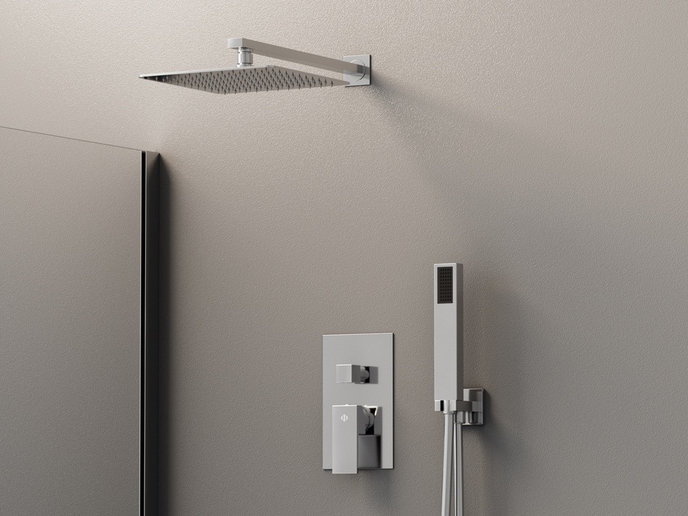 Conjunto completo empotrable cuadrado para ducha fabricado en latón, con caja de registro, disponible en formato monomando y termostático y acabados cromado y negro mate. Rociador y brazo incluido.