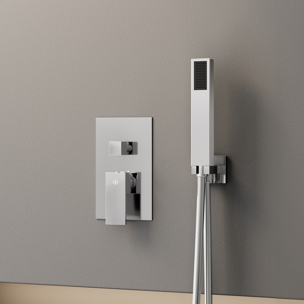 Cuerpo fabricado en latón, con caja de registro, cartucho cerámico de 35 mm sedal y placa de 20x12 cm. Kit de ducha incluido (soporte más mango de ducha). Disponible en 2 acabados cromado y negro mate. No incluye rociador superior.
