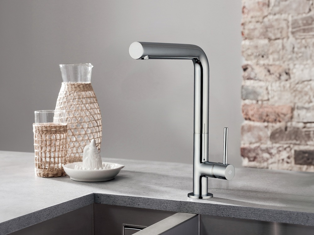 Grifo de cocina Silver de diseño moderno y minimalista. El grifo es de color plateado y tiene un acabado cromado brillante. Su estructura es cilíndrica con líneas limpias y rectas. La parte superior del grifo se curva en ángulo recto hacia abajo, formando el caño por donde sale el agua. En la base del grifo, hay una palanca maneta cilíndrica para el control del flujo y la temperatura del agua.