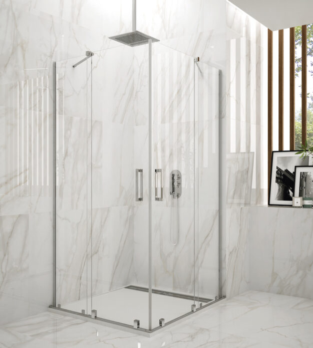 Mampara de ducha angular al vértice compuesta por fijos de 8mm y correderas de 6mm con tratamiento antical, perfilería en aluminio pulido brillo. Doble rodamiento superior en nylon silencioso y doble rodamiento inferior con liberador de hoja para facilitar la limpieza. Entrega inmediata.