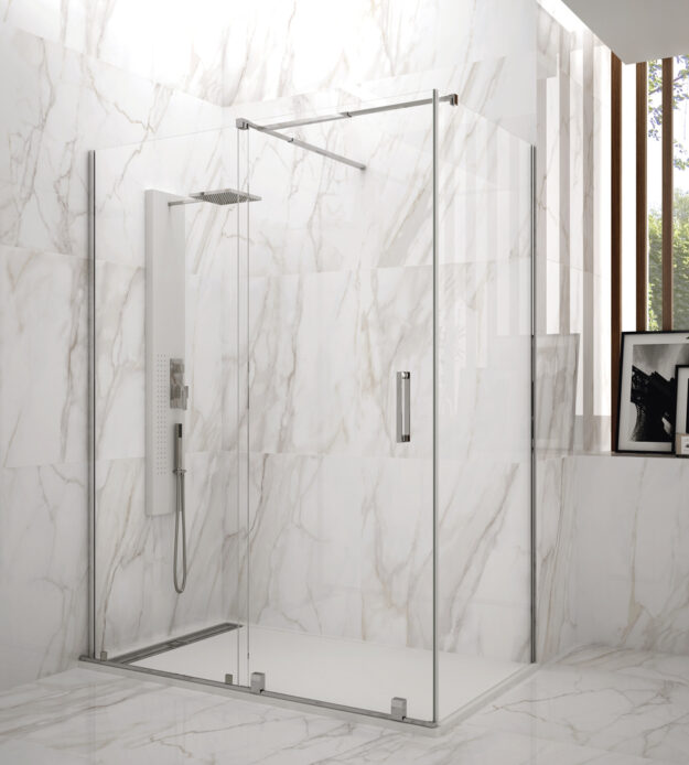 Mampara de ducha angular compuesta por un frontal con fijo de 8mm y corredera de 6mm más lateral de 8mm, perfilería en aluminio pulido brillo y cristal templado con tratamiento antical. Doble rodamiento superior en nylon silencioso y doble rodamiento inferior con liberador de hoja. Entrega inmediata