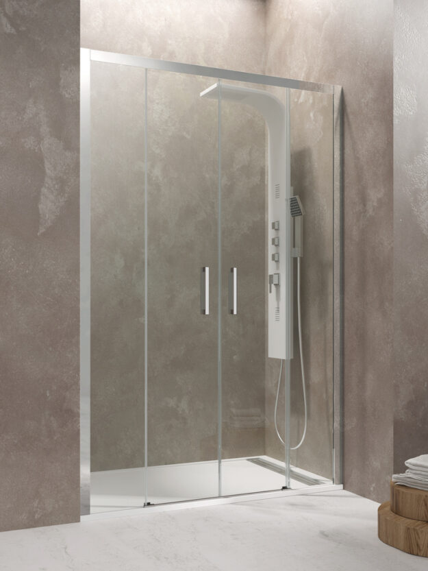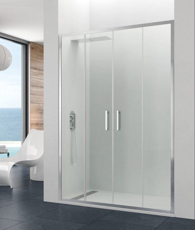 Mampara de ducha frontal con 2 fijos de 8mm y 2 puertas correderas de 6mm con tratamiento antical. Cristal templado y perfilería en aluminio pulido brillo. Doble rodamiento superior en nylon silencioso y doble rodamiento inferior con liberador de hoja para facilitar la limpieza. Entrega inmediata.