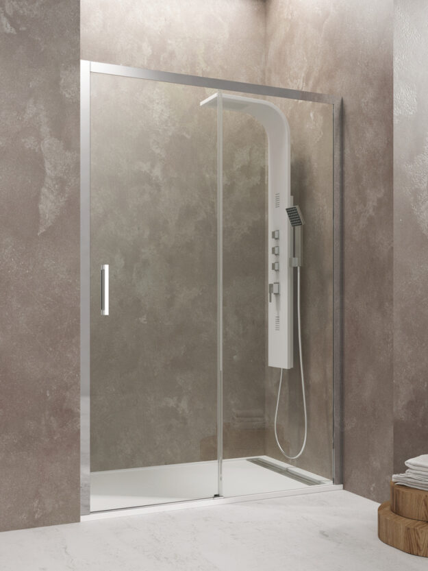 Mampara de ducha frontal, con fijo de 8mm y puerta corredera de 6mm, perfilería en aluminio pulido brillo con cristales templados y tratamiento antical. Doble rodamiento en nylon silencioso con antivuelco. Diseño actual sin perfilería inferior. Entrega inmediata.