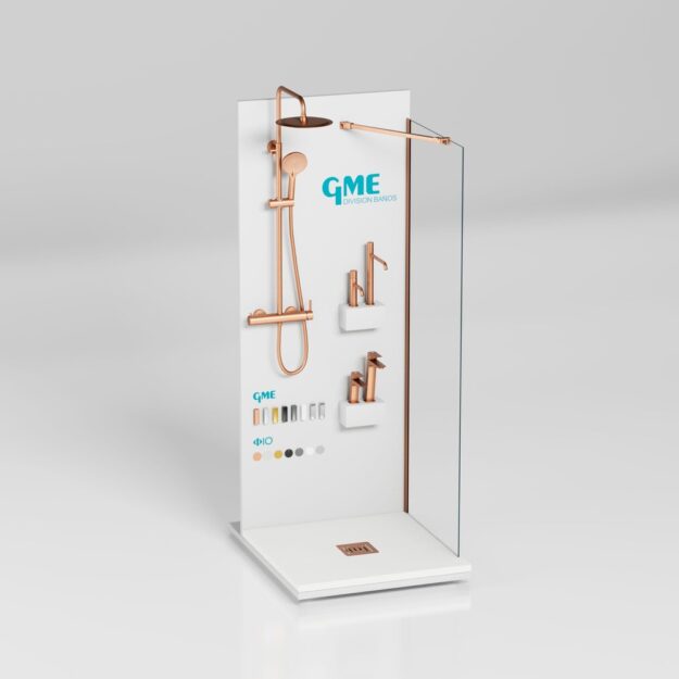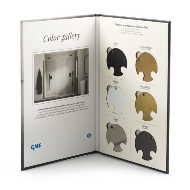 Libro muestrario de gama de colores de grifería IO by GME. Negro, oro, níquel, cobre, titanio y blanco.