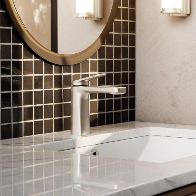 Grifo empotrable monomando para lavabo fabricado en latón con un diseño rectangular. Disponible en 7 acabados: cromo, negro mate, blanco, titanio, oro PVD, cobre PVD y níquel PVD, para que puedas elegir el estilo que mejor se adapte a tu baño.